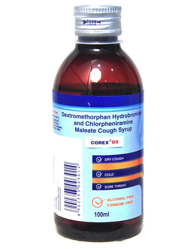 Corex DX Syrup is a combination medicine which belongs to the class of expectorants. It is used in the treatment of dry cough. This medicine works by preventing nerve signals from the brain's cough centre from reaching the muscles that cause coughing and thus reduce cough. You may experience common side effects like headache, dizziness, numbness, drowsiness, or nausea.