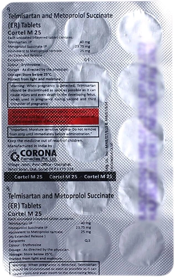 Cortel M 25 Tablet ER is a medicine used for treating high blood pressure. By lowering blood pressure, it helps in preventing future heart attacks and strokes. Early treatment with this medicine also improves the chances of survival in patients with heart attacks.