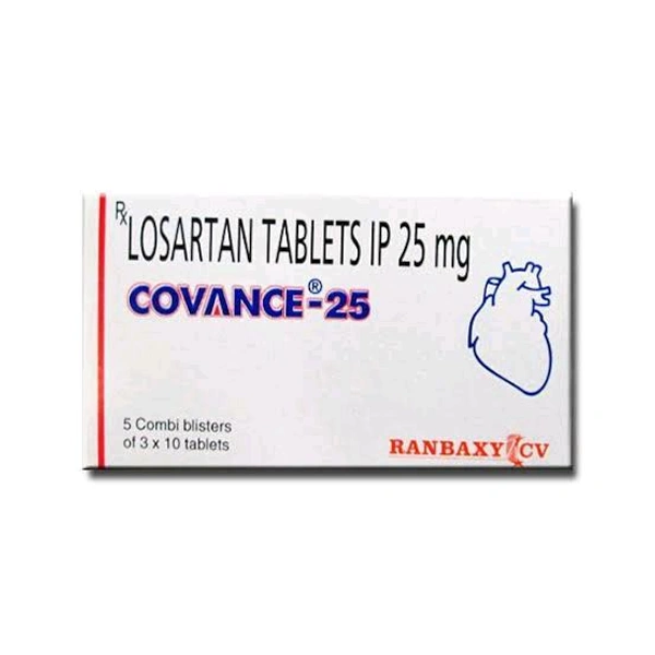 Covance 25 Tablet is used to treat high blood pressure (hypertension), chronic heart failure, and diabetic nephropathy. It is also used to decrease the risk of stroke in people who have high blood pressure and a heart condition called left ventricular hypertrophy (enlargement of the walls of the left side of the heart). It contains Losartan, which works by blocking the action of certain natural substances that tighten the blood vessels, allowing the blood to flow more smoothly and the heart to pump more efficiently. In some cases, you may experience dizziness, tiredness, low blood pressure, weakness, anaemia (lack of blood), hyperkalaemia (high potassium levels in the blood), change in kidney function, orthostatic hypotension (low blood pressure when standing up from lying or sitting position) or hypoglycaemia (low blood sugar