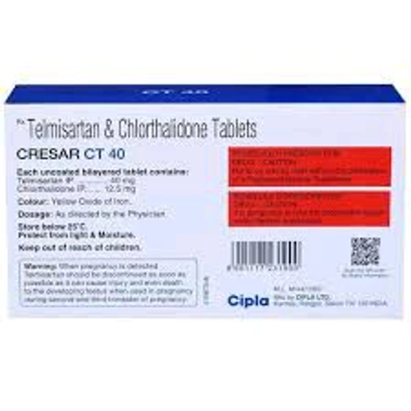 Cresar CT 40 Tablet is a combination of two medicines that helps keep the blood pressure under control. The medicine works by reducing the risk of strokes and myocardial infarction (heart attack), thereby treating hypertension (high blood pressure).