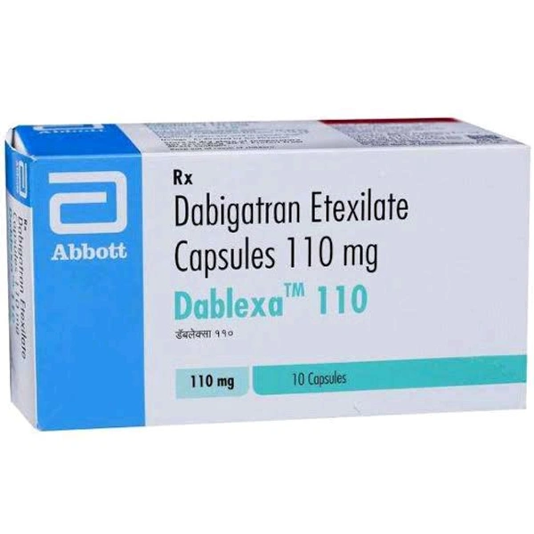 Dablexa 110 Capsule is used to prevent the risk of stroke and heart attack in patients with atrial fibrillation (irregular heart rhythm), reducing blood clot formation. Besides this, it is also used to prevent deep vein thrombosis (blood clots in leg veins) and pulmonary embolism (blood clots in the lung) and reduces the risk of getting clots in people who have undergone knee or hip replacement surgeries. It contains Dabigatran, which works by inhibiting the production of clotting factors and prevents blood clot formation. It makes your blood flow easily through your veins, making it less likely to form a serious blood clot. It may cause side effects such as bleeding, anaemia (low number of red blood cells), nausea, stomach pain, and indigestion. Before taking this medicine, you should tell your doctor if you are allergic to any of its components or if you are pregnant/breastfeeding, and about all the medications you are taking and pre-existing medical conditions.