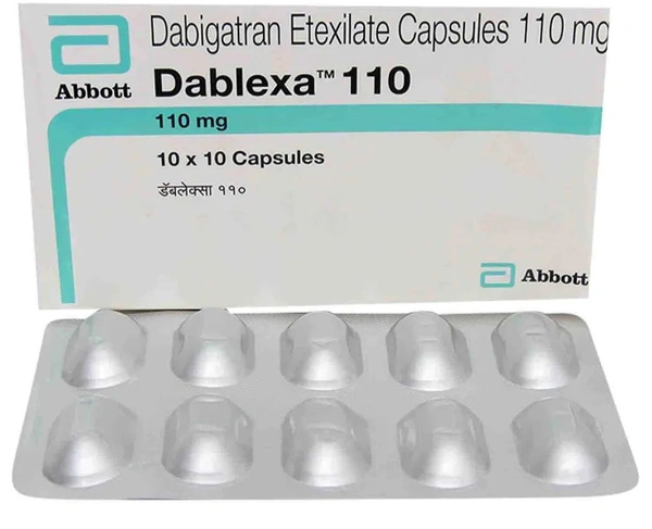 Dablexa 110 Capsule is used to prevent the risk of stroke and heart attack in patients with atrial fibrillation (irregular heart rhythm), reducing blood clot formation. Besides this, it is also used to prevent deep vein thrombosis (blood clots in leg veins) and pulmonary embolism (blood clots in the lung) and reduces the risk of getting clots in people who have undergone knee or hip replacement surgeries. It contains Dabigatran, which works by inhibiting the production of clotting factors and prevents blood clot formation. It makes your blood flow easily through your veins, making it less likely to form a serious blood clot. It may cause side effects such as bleeding, anaemia (low number of red blood cells), nausea, stomach pain, and indigestion. Before taking this medicine, you should tell your doctor if you are allergic to any of its components or if you are pregnant/breastfeeding, and about all the medications you are taking and pre-existing medical conditions
