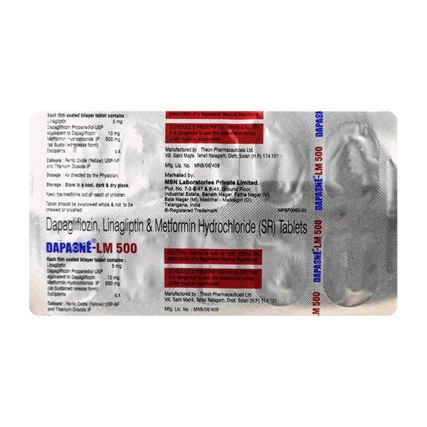 Dapaone LM 500mg Tablet is a medicine used along with proper diet and exercise to lower high blood sugar levels in individuals with type 2 diabetes. It improves insulin sensitivity, reduces glucose production, and increases glucose excretion. It lowers the risk of complications in patients with type 2 diabetes.
