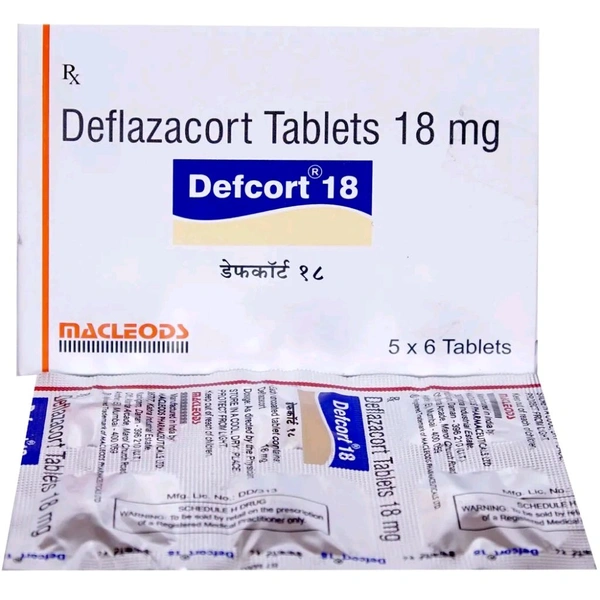 Defcort 18 Tablet is used to treat Duchene muscular dystrophy in adults and children above 2 years of age. It contains Deflazacort, which binds to immune cells, resulting in the inhibition of inflammation and autoimmune diseases that occur due to the production of chemicals called cytokines responsible for inflammation. It makes organ transplantation possible and treats muscle disorders like Duchenne muscular dystrophy. Some people may experience side effects such as nausea, chest pain, vomiting, drowsiness, headache, dizziness, skin rash, tremors, nervousness, diarrhoea and fast heartbeats. Before taking this medicine, you should tell your doctor if you are allergic to any of its components or if you are pregnant/breastfeeding, and about all the medications you are taking and pre-existing medical conditions.