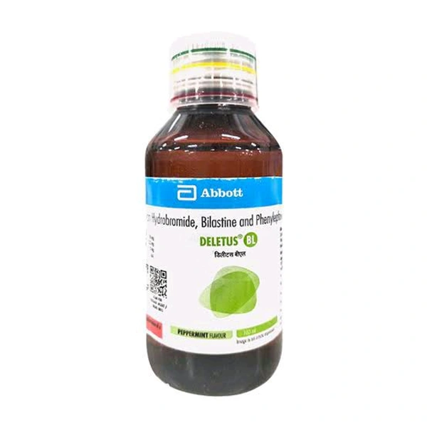 Deletus BL Peppermint Flavour Syrup 100 ml contains Bilastine, Dextromethorphan and Phenylephrine, which are used to provide relief from acute cough and upper respiratory symptoms, including nasal congestion, associated with allergy or the common cold. Here, Dextromethorphan affects the signals in the brain that trigger the cough reflex, Phenylephrine shrinks blood vessels in the nasal passages, And Bilastine blocks the effects of a chemical messenger known as 'histamine', which is naturally involved in allergic reactions.