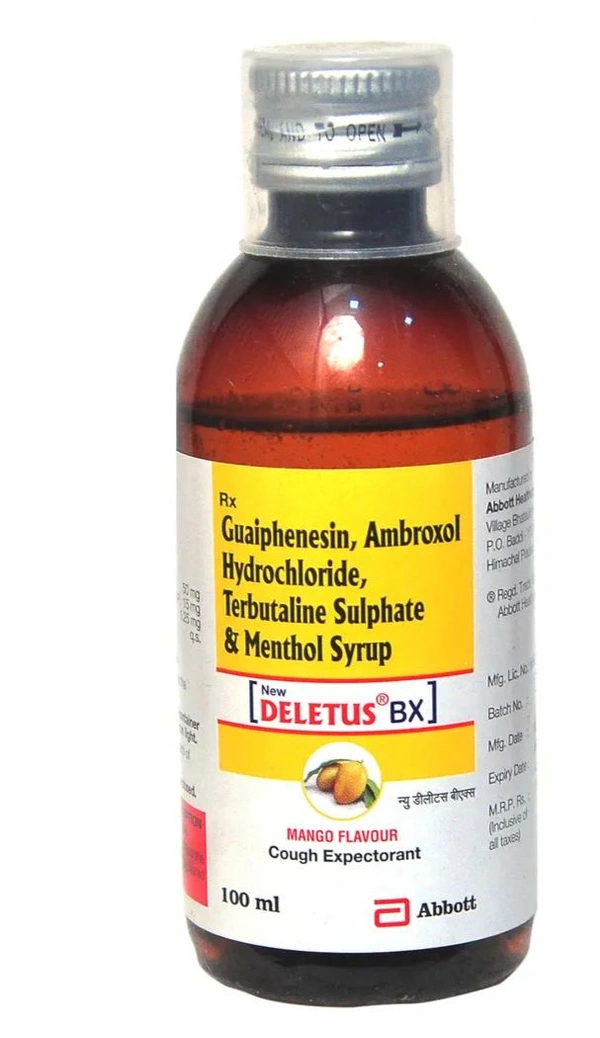 Deletus-BX Cough Expectorant effectively treats wet cough (cough with mucus) in children. It helps in thinning the mucus by increasing its water content. This relieves throat irritation and clears congestion, enabling easy breathing in your child.