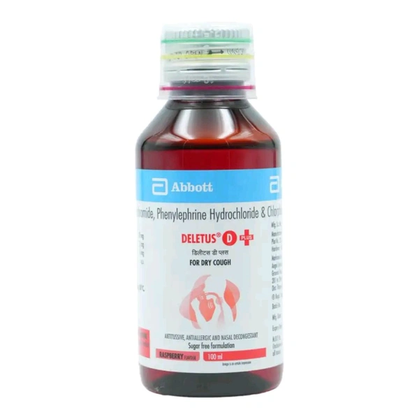 Deletus D Plus Syrup is a medicine used in the treatment of common cold and cough. It can provide quick relief from cough and common cold symptoms like runny nose, stuffy nose, sneezing, watery eyes, and congestion or stuffiness.