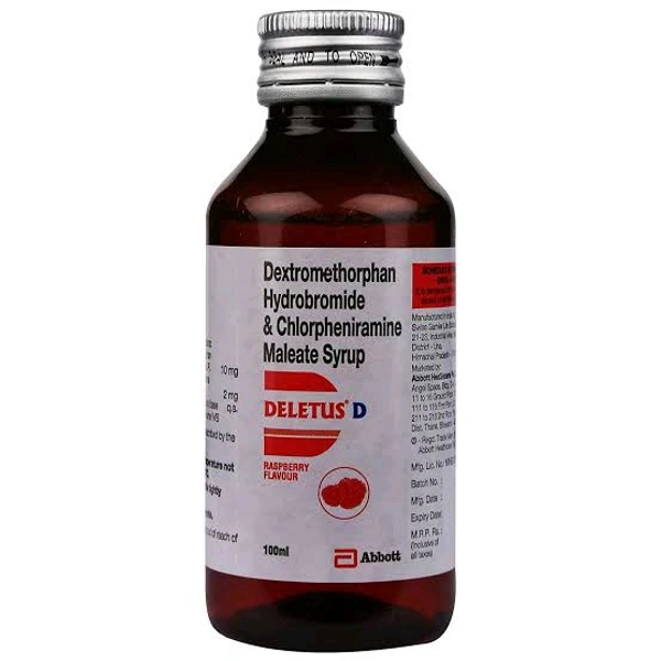 Deletus D Syrup Strawberry is a combination of two medicines used in the treatment of dry cough. It can provide temporary relief of cough due to throat irritation, sneezing, and running nose. It works by reducing the activity of the brain's cough center and blocking the effects of histamine.