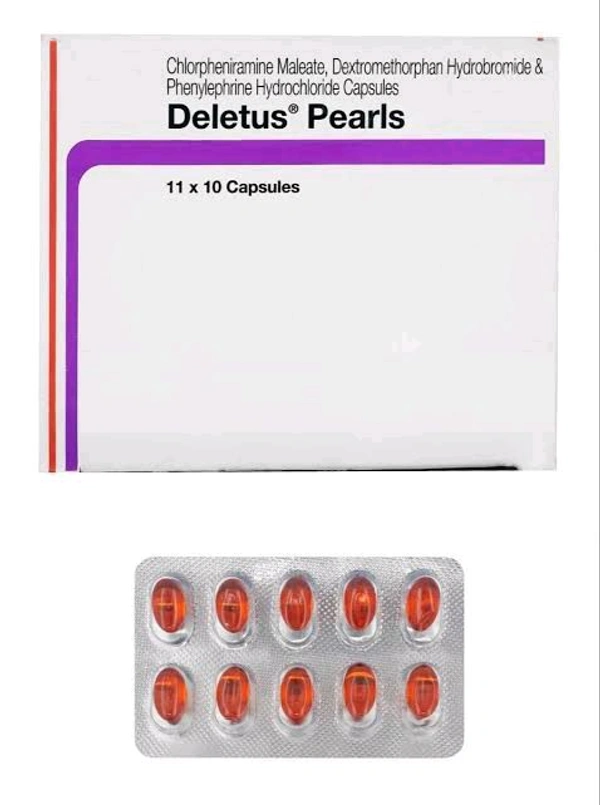 Deletus Pearls Capsule is a combination medicine which belongs to the class of expectorants. It is used in the treatment of dry cough and also sometimes to relieve allergic symptoms. This medicine works by preventing nerve signals from the brain's cough centre from reaching the muscles that cause coughing and thus reduce cough. Some people may experience side effects like dry mouth, throat or nose, drowsiness, blurred vision, constipation, dizziness, restlessness, or excitation