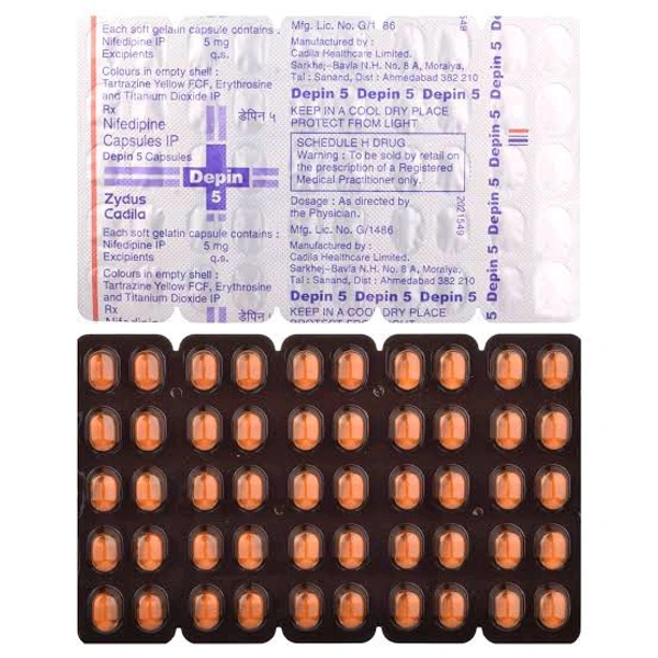 Depin 5 Capsule is a medicine used to treat high blood pressure (hypertension) and to prevent angina (heart-related chest pain). It belongs to a class of medicines known as calcium channel blockers. It lowers blood pressure and reduces the workload of the heart. This helps prevent heart attacks and strokes.