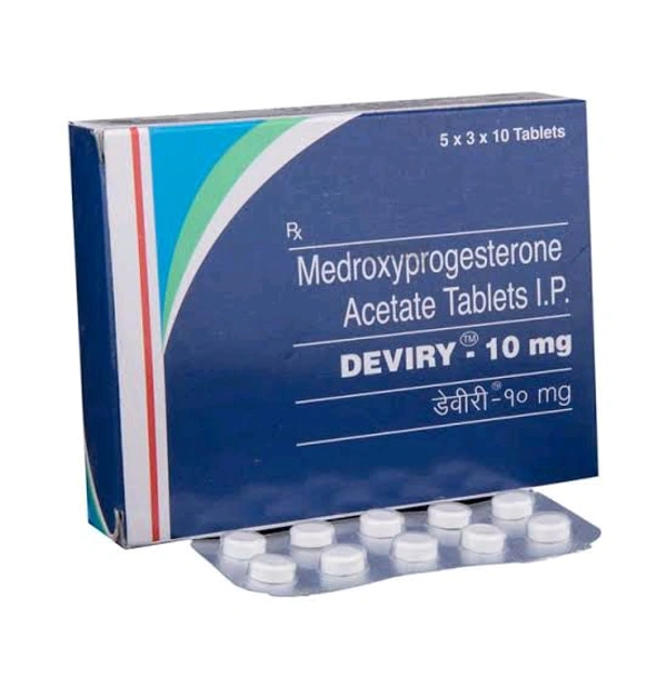 Deviry 10 mg Tablet is used in the treatment of amenorrhea (absence of menstruation), irregular periods, uterine bleeding, endometrial hyperplasia (thickening of the uterus), and endometriosis. It works by replacing or supplementing the naturally produced female sex hormone called progesterone.