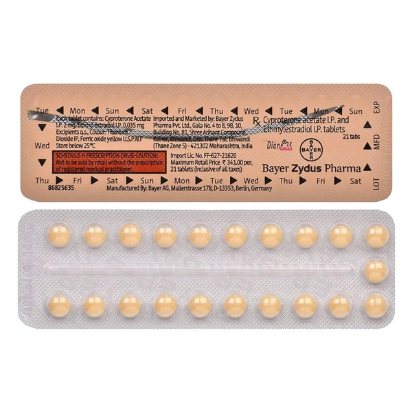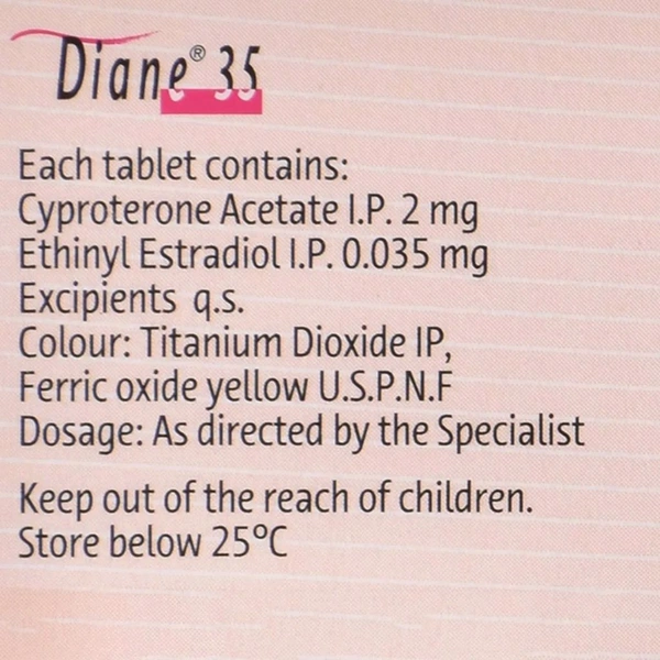 Diane 35 Tablet contains Ethylestradiol and Cyproterone. It is used to treat moderate to severe acne related to androgen sensitivity and/or hirsutism (excess hair growth) in women of reproductive age. It works by blocking the production of androgens (male hormones) in the ovaries, thereby helping reduce acne and hair growth. In some cases, this medication may cause nausea, abdominal pain, headache, weight gain and mood changes.