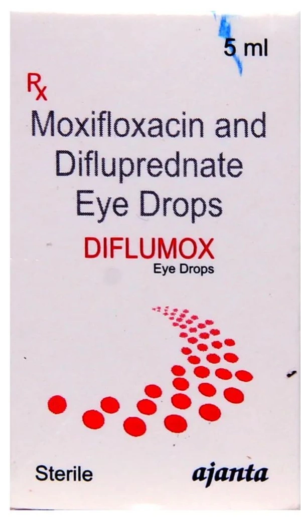 Diflumox Eye Drops 5 ml is used to treat bacterial infections of the eye. It contains Difluprednate and Moxifloxacin which work by killing the infection-causing bacteria and blocking the chemical messengers that cause swelling, itching, and redness. In some cases, this medicine may cause side effects such as blurred vision, dry/watery eyes, and discomfort. Avoid touching the tip of the container to the eye, eyelids, or surrounding areas as it may contaminate the product.
