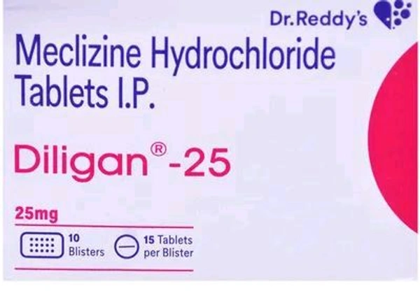 Diligan-25 Tablet is used to treat travel sickness (also called motion sickness). It is also used to treat dizziness and sickness caused by inner ear problems (such as vertigo). It contains Meclizine, which blocks the effects of histamine in your brain to reduce symptoms of travel sickness and also helps improve blood flow in the inner ear and reduces symptoms caused by vertigo. It may cause side effects such as sleepiness, dry mouth, blurred vision, headache, and lethargy. Before using this medicine, you should tell your doctor if you are allergic to any of its components or if you are pregnant/breastfeeding, and about all the medications you are taking and pre-existing medical conditions.