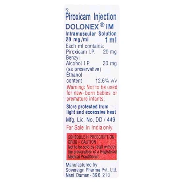 Dolonex 1 ml contains piroxicam which is an NSAID (Non-Steroidal Anti-Inflammatory Drugs) medicine. It is mainly used to relieve pain, swelling, and stiffness caused by osteoarthritis, ankylosing spondylitis, and rheumatoid arthritis (inflammation of the joints). It is sometimes also used to reduce back pain. This medicine inhibits cyclo-oxygenase (COX) enzymes and this helps reduce pain.