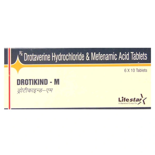 Drotikind M Tablet is used to treat abdominal pain, muscle pain, migraine headache, functional bowel disorders, dysmenorrhea (menstrual cramps), heavy bleeding during periods, renal colic pain, and pain after surgery. It contains Drotaverine and Mefenamic acid, which works by reducing calcium reuptake by the cells, thereby correcting the body's calcium levels and relieving contractions associated with smooth muscles. Also, it blocks the effect of chemical messengers that cause pain and inflammation. In some cases, it may cause common side effects such as gastrointestinal disturbances, feeling thirsty, nausea, vomiting, diarrhoea, dry mouth, rashes and itching. Before taking this medicine, you should tell your doctor if you are allergic to any of its components or if you are pregnant/breastfeeding, and about all the medications you are taking and pre-existing medical conditions.