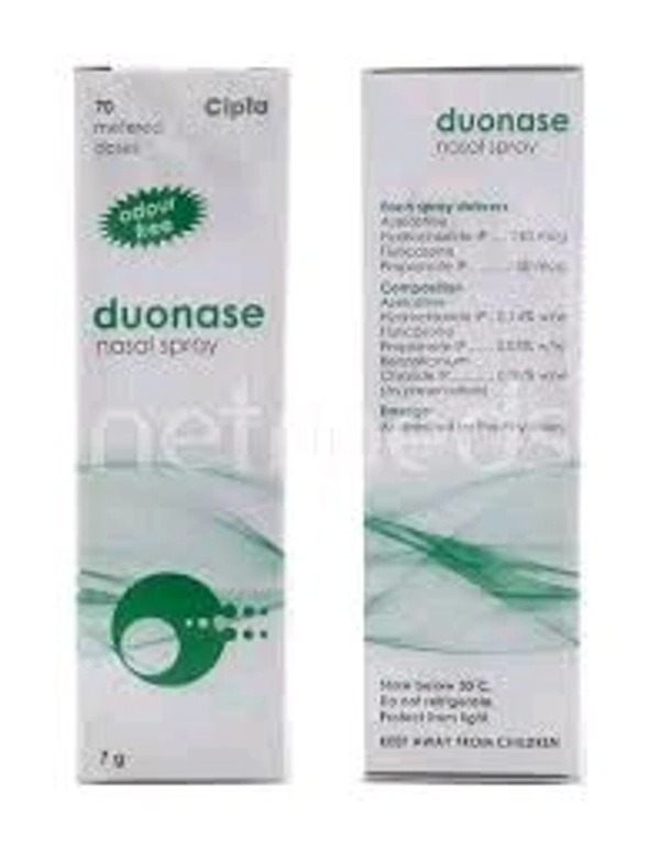 Duonase F Nasal Spray 70 metered dose is used to treat an itchy, stuffy or runny nose, sneezing, or other symptoms caused by seasonal hay fever (allergic rhinitis). It works by reducing certain substances in the body called histamines that are responsible for the allergic symptoms.
