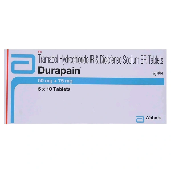 Durapain Tablet is used to get relief from pain and inflammation (redness and swelling). It contains Diclofenac and Tramadol, which works by blocking the release of chemical messengers responsible for causing pain and inflammation. Also, it blocks the transmission of pain signals to the brain. It may cause common side effects such as nausea, loss of appetite, vomiting, dizziness, indigestion, sleepiness, constipation, heartburn, stomach pain, and dryness in the mouth. Before taking this medicine, you should tell your doctor if you are allergic to any of its components or if you are pregnant/breastfeeding, and about all the medications you are taking and pre-existing medical conditions.