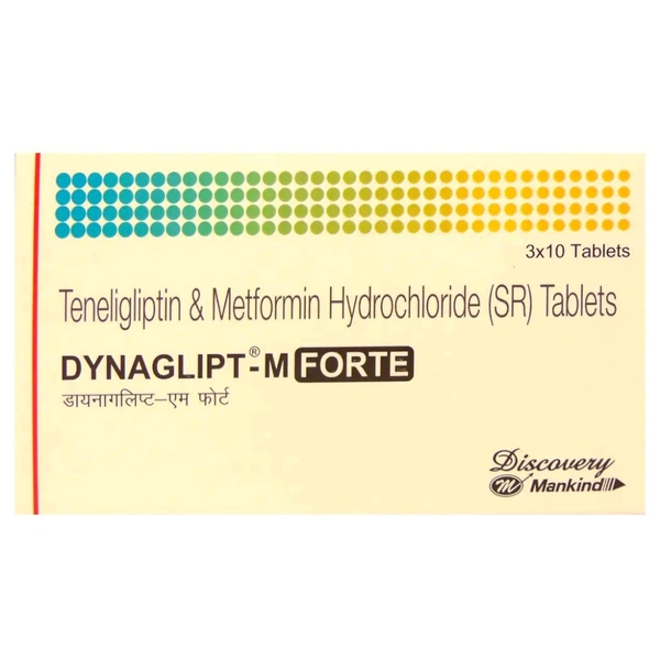 Dynaglipt-M Forte Tablet is used to treat type 2 diabetes mellitus. It works by decreasing liver glucose production, lowering intestinal glucose uptake and increasing insulin levels in the body. In some cases, this medicine may cause side effects such as nausea, vomiting, diarrhoea, headache, and stomach ache. Before taking this medicine, inform the doctor if you are pregnant or breastfeeding, taking any other medication, or have any pre-existing medical conditions.