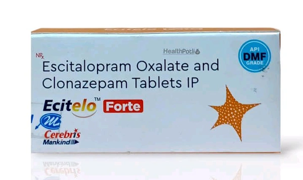 Ecitelo Forte 10/0.5 Tab is used to treat anxiety disorders. It contains Clonazepam and Escitalopram, which produces a calming effect by suppressing the abnormal activity of nerve cells and increases the serotonin hormone levels that improve mood, behaviour, and cognition in patients with anxiety. It may cause common side effects such as nausea, headache, dizziness, confusion, drowsiness, fatigue, sleeping problems, breathlessness, poor coordination of movements, stomach upset, decreased libido (low sexual desire), and memory problems. Before taking this medicine, you should tell your doctor if you are allergic to any of its components or if you are pregnant/breastfeeding, and about all the medications you are taking and pre-existing medical conditions.