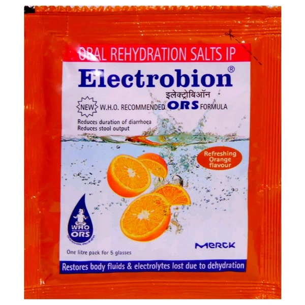 Electrobion Orange Powder is used to treat or prevent dehydration (too much loss of body water). It is indicated as a source of electrolytes, water, and calories and helps in replacing the fluids and minerals. Inform the doctor if you are pregnant or breastfeeding, taking any other medication, or have any pre-existing medical conditions.