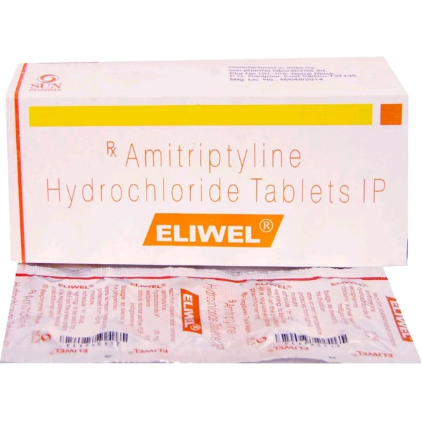 Eliwel Tablet is used to treat depression, neuropathic pain, chronic tension-type headaches, and migraine in adults. Additionally, it is also used to treat bedwetting at night in children aged 6 years and above. It contains Amitriptyline, which works by affecting certain chemical messengers (serotonin and norepinephrine) in the brain, which communicate between brain cells, thereby helping to regulate mood and prevent depression. Additionally, it reduces the transmission of pain signals, thereby providing relief from neuropathic pain. In some cases, you may experience certain common side effects such as sleepiness, drowsiness, headache, irregular heartbeat, dry mouth, constipation, nausea, weight gain, slurred or slow speech, and a congested nose. Before taking this medicine, you should tell your doctor if you are allergic to any of its components or if you are pregnant/breastfeeding, and about all the medications you are taking and pre-existing medical conditions.