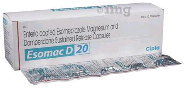 Esomac D 20 Capsule SR is a prescription medicine used to treat gastroesophageal reflux disease (Acid reflux) and indigestion by relieving the symptoms such as heartburn, stomach pain, or irritation. It also neutralizes the acid in the stomach and promotes easy passage of gas to reduce stomach discomfort.