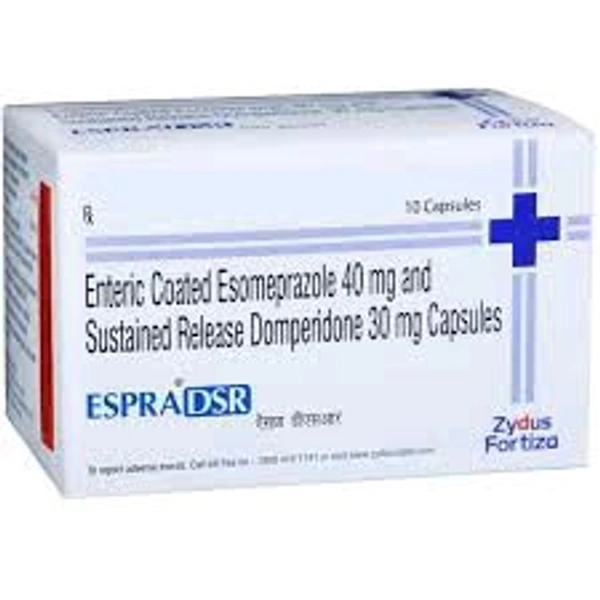 Espra DSR Capsule is a prescription medicine used to treat gastroesophageal reflux disease (acid reflux). It helps relieve symptoms such as heartburn, stomach pain, or irritation. It also neutralizes the acid in the stomach and promotes easy gas passage to reduce stomach discomfort.