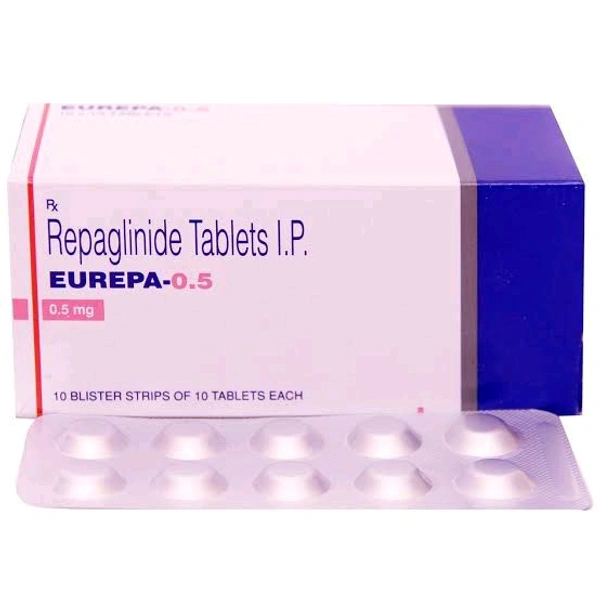 Eurepa 0.5 Tablet is used to lower blood sugar levels in adults with type 2 diabetes mellitus. It is usually prescribed along with other diabetes medicines to achieve adequate blood sugar control. It also prevents serious complications of diabetes like kidney damage and blindness
