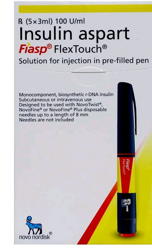 Fiasp FlexTouch 100U/ml Prefilled Pen 3 ml is used for the treatment of diabetes mellitus in both children (above two years of age) and adults. It typically begins working after 10-20 minutes and will last for between 3 and 5 hours. Due to this short action, it should normally be taken in combination with intermediate-acting or long-acting insulin preparations. It contains Insulin aspart, which works by ensuring rapid and consistent sugar control. It is a fast-acting form of insulin that helps lower blood sugar levels after food intake. It prevents the risk of having severe complications of diabetes. It stimulates the recovery of sugar in muscle and fat cells and thus suppresses sugar production in the liver. It may cause common side effects such as hypokalaemia (low potassium), hypoglycaemia (low blood sugar level), local injection site reactions, lipodystrophy (fat deposition under the skin), rash, and itching at the injection site. Along with this medicine, you should take a healthy diet, exercise regularly, and maintain weight as advised by your doctor.