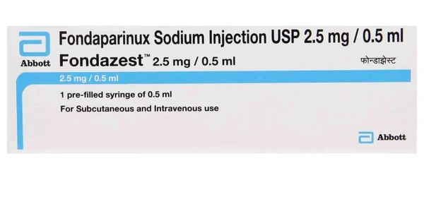Fondazest 2.5mg Injection is an anticoagulant medicine used in the prevention of blood clot formation. This medicine prevents/treat conditions like deep vein thrombosis (blood clots in leg veins), pulmonary embolism (blood clots in the lung), heart attack, and severe angina. This medicine works by inhibiting the action of clotting factors, thereby preventing the conversion of fibrinogen to fibrin, a protein and helps prevent blood clot formation. Common side effects include unusual bleeding, anemia, bruising or swelling.
