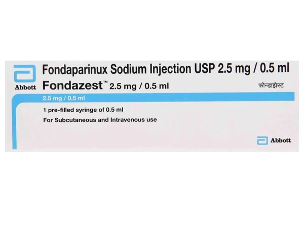 Fondazest 2.5mg Injection is an anticoagulant medicine used in the prevention of blood clot formation. This medicine prevents/treat conditions like deep vein thrombosis (blood clots in leg veins), pulmonary embolism (blood clots in the lung), heart attack, and severe angina. This medicine works by inhibiting the action of clotting factors, thereby preventing the conversion of fibrinogen to fibrin, a protein and helps prevent blood clot formation. Common side effects include unusual bleeding, anemia, bruising or swelling.