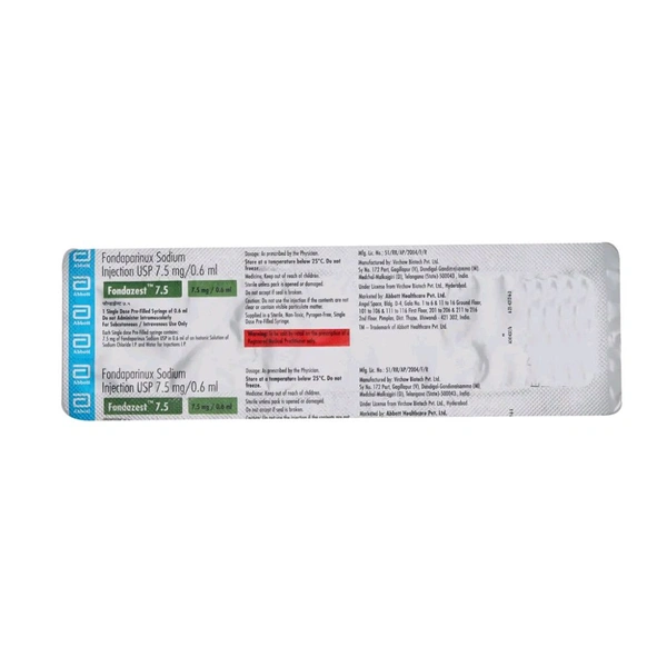 Fondazest 7.5mg Injection is an anticoagulant medicine used in the prevention of blood clot formation. This medicine prevents/treat conditions like deep vein thrombosis (blood clots in leg veins), pulmonary embolism (blood clots in the lung), heart attack, and severe angina. This medicine works by inhibiting the action of clotting factors, thereby preventing the conversion of fibrinogen to fibrin, a protein and helps prevent blood clot formation. Common side effects include unusual bleeding, anemia, bruising or swelling.