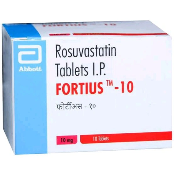 Fortius-10 Tablet is used in the treatment of high cholesterol and to reduce the risk of stroke and heart attack. It contains Rosuvastatin, which slows down cholesterol production in the body and decreases the amount of cholesterol that may build up on the arteries walls and block blood flow to brain, heart and other body parts. Thus, it lowers cholesterol and fats levels and helps to prevent stroke, heart disease and heart attack. It may cause side effects such as myalgia (muscle pain), asthenia (lack of energy), nausea, headache, abdominal pain, muscle pain, weakness, and daytime drowsiness. Before taking this medicine, you should tell your doctor if you are allergic to any of its components or if you are pregnant/breastfeeding, and about all the medications you are taking and pre-existing medical conditions.