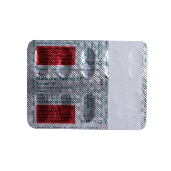 Frisium 20 mg Tablet is used to treat epilepsy (fits) and severe anxiety over a short period. Also, it is used in combination with other medicines to treat schizophrenia (a mental illness). It prevents fits by stabilizing the electrical activity of nerve cells in the brain. Also, it calms nerve cells and helps in reducing anxiety and induces sleep. Some people may experience side effects such as restlessness, irritability, drowsiness, constipation, aggressive behaviour, tiredness or breathing problems. Before taking this medicine, you should tell your doctor if you are allergic to any of its components or if you are pregnant/breastfeeding, and about all the medications you are taking and pre-existing medical conditions.