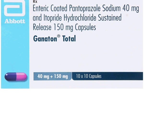 Ganaton Total Capsule is used to treat acidity, GERD (gastro-oesophagal reflux disease), and peptic ulcers. It contains Pantoprazole and Itopride, which decrease the production of acid. Additionally, it works by accelerating gastric emptying and improving gastric sensitivity and tone. It also has anti-emetic action. Thus, it helps in preventing acid reflux, thereby providing relief from acidity. In some cases, you may experience certain common side effects such as headache, nausea, stomach pain, dizziness and diarrhoea. Before taking this medicine, you should tell your doctor if you are allergic to any of its components or if you are pregnant/breastfeeding, and about all the medications you are taking and pre-existing medical conditions.