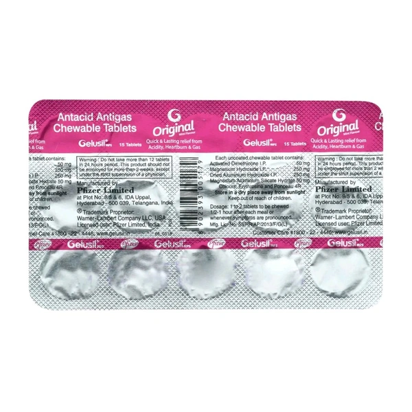 Gelusil MPS Chewable Tablet is used to treat hyperacidity with peptic ulcer, gastritis, dyspepsia, peptic esophagitis, hiatus hernia, and flatulence (gas). It contains Activated Dimethicone, Magnesium Hydroxide, Dried Aluminium Hydroxide and Magnesium Aluminium Silicate Hydrate. These medications combine to neutralise stomach acid and suppress pepsin, a proteolytic enzyme. Thus, they relieve symptoms of hyperacidity and other associated conditions.