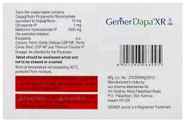 Gemer Dapa XR 10/1/1000 Tablet is a medicine that helps to control high blood glucose (sugar) levels. It helps get rid of extra glucose from your body through urine. It also improves the body's response to the hormone insulin, which is responsible for regulating blood glucose (sugar) levels in our body.