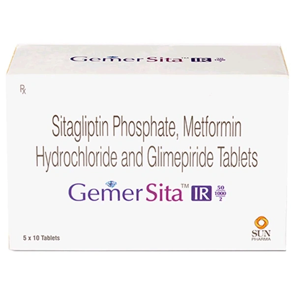 Gemer Sita IR 50/1000/2 Tablet is an antidiabetic medicine used to treat type II diabetes. It contains Metformin (biguanides), which works by reducing the sugar production by cells in the liver and delays sugar absorption from the intestine. Sitagliptin (dipeptidyl peptidase-4 inhibitor) works by increasing the amounts of certain natural substances that lower blood sugar when it is high. Glimepiride (sulfonylureas) works by stimulating beta cells in the pancreas that produce insulin, which helps to remove sugar from the blood