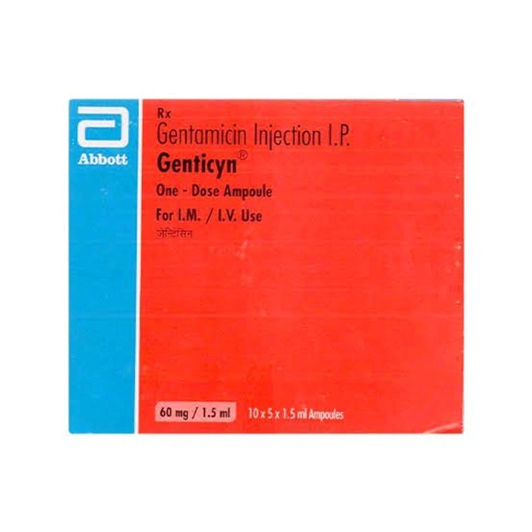 Genticyn 60mg Injection is an antibiotic used to prevent or treat a wide variety of bacterial infections. This may include infections of the urinary tract, bones and joints, lungs (e.g., pneumonia), brain (e.g., meningitis), sepsis, and some others. However, it is not effective for gonorrhea.
