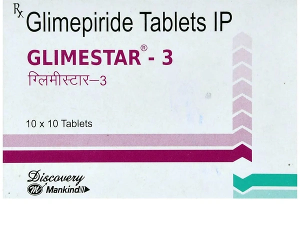 Glimestar 3 mg Tablet is used to lower raised blood sugar levels in Type 2 diabetes mellitus (non-insulin-dependent diabetes mellitus - NIDDM). It contains Glimepiride which acts on insulin-secreting cells called beta cells inside the pancreas and activates calcium channels on cells which lets insulin pass out of the cell. This insulin then makes each cell in the body take up glucose and utilize it, thus lowering raised blood glucose. It may cause side effects such as allergic reaction (skin rash, hives, sensitivity to sun rays), liver dysfunction (jaundice, bile duct blockage, and hepatitis), seizures, or low glucose levels. Before taking this medicine, you should tell your doctor if you are allergic to any of its components or if you are pregnant/breastfeeding, and about all the medications you are taking and pre-existing medical conditions.