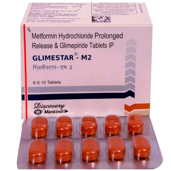 Glimestar M 2 Tablet is used to treat type 2 diabetes. It contains Glimepiride and Metformin which works by decreasing the amount of glucose absorbed from the food and the amount of glucose made by the liver. It helps the pancreas to produce insulin and helps the body use insulin efficiently. In some cases, this medicine may cause side effects such as stomach pain, nausea, diarrhoea, vomiting, headache or metallic taste. Inform the doctor if you are pregnant or breastfeeding, taking any other medication, or have any pre-existing medical conditions.