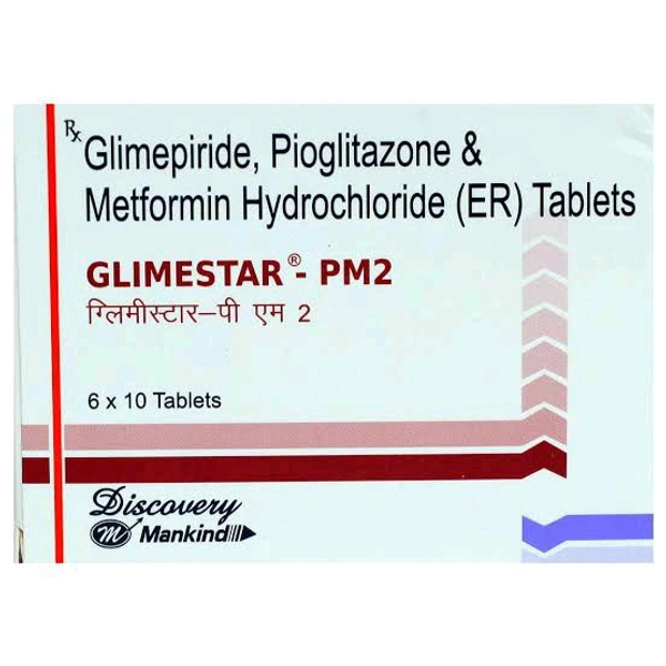 Glimestar-PM2 Tablet ER is a combination medicine that helps control blood sugar levels. This medicine is used together with diet and exercise to improve blood sugar control in adults with type 2 diabetes mellitus. It helps in proper utilisation of insulin, thereby lowering the blood sugar levels.