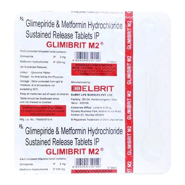 Glimibrit M2 is a combination medication, containing Glimepiride and Metformin, used to manage type 2 diabetes in adults. It helps regulate blood sugar levels when diet and exercise alone are not sufficient. The medication works by stimulating the pancreas to produce more insulin and enhancing insulin's effectiveness, while also reducing the amount of sugar released by the liver.