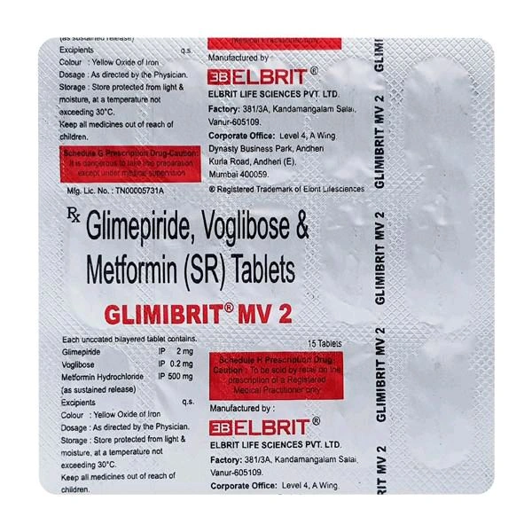 Glimibrit MV 2mg/500mg/0.2mg Tablet belongs to a category of medicines known as anti-diabetic drugs. It is a combination of medicines used to treat type 2 diabetes mellitus in adults. It helps control blood sugar levels in people with diabetes.