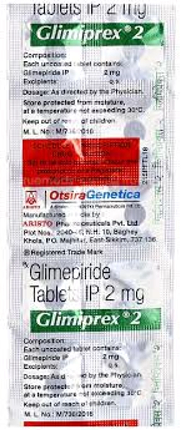 Glimiprex 2 Tablet belongs to a group of medicines called sulfonylureas and is used to treat type 2 diabetes mellitus in adults. It helps control blood sugar levels in people with diabetes thereby preventing serious complications of diabetes such as kidney damage and blindness.