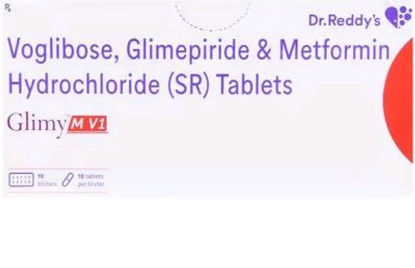 Glimy M V1 Tablet is used to treat type 2 diabetes mellitus. It acts by increasing the amount of insulin released by the pancreas. Thus, prevent the blood glucose levels from rising to very high levels and keeps your diabetes under control. It may cause certain common side effects such as hypoglycaemia (low blood glucose levels), taste change, nausea, diarrhoea, stomach pain, headache, and upper respiratory symptoms. Before taking this medicine, you should tell your doctor if you are allergic to any of its components or if you are pregnant/breastfeeding, and about all the medications you are taking and pre-existing medical conditions.
