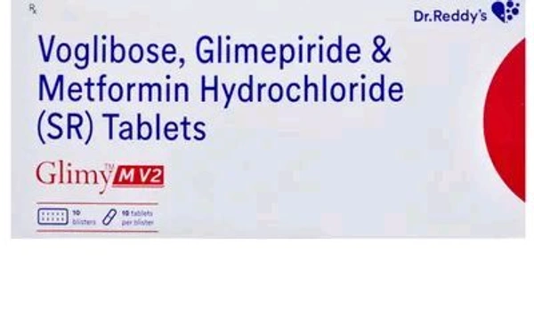 Glimy M V 2 Tablet is used to treat type 2 diabetes mellitus. It acts by increasing the amount of insulin released by the pancreas. Thus, prevent the blood glucose levels from rising to very high levels and keeps your diabetes under control. It may cause certain common side effects such as hypoglycaemia (low blood glucose levels), taste change, nausea, diarrhoea, stomach pain, headache, and upper respiratory symptoms. Before taking this medicine, you should tell your doctor if you are allergic to any of its components or if you are pregnant/breastfeeding, and about all the medications you are taking and pre-existing medical conditions.
