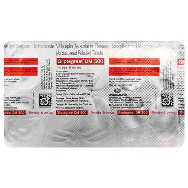 Gliptagreat DM 500 Tablet is an antidiabetic medicine used to treat Type II Diabetes. It contains Dapagliflozin (sodium-glucose cotransporter-2 inhibitors), Vildagliptin (dipeptidyl peptidase-4 inhibitor), and Metformin (biguanides), which work by increasing the amounts of certain natural substances that lower blood sugar when it is high. Gliptagreat DM 500 Tablet may cause side effects, such as vomiting, nausea, abdominal pain, headache, frequent urination, and allergic reactions