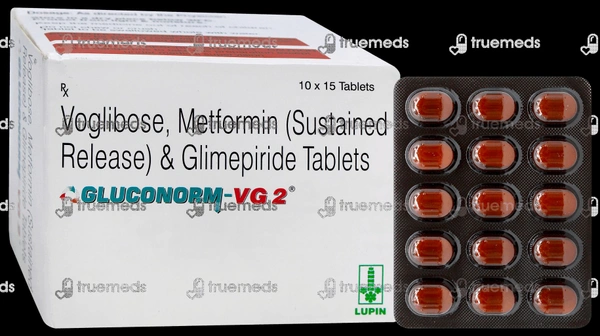 Gluconorm-VG 2 Tablet SR is a combination of three medicines: Glimepiride, Metformin and Voglibose. This medicine is used in the treatment of type 2 diabetes mellitus (DM). It improves the blood glucose levels in adults when taken along with proper diet and regular exercise.